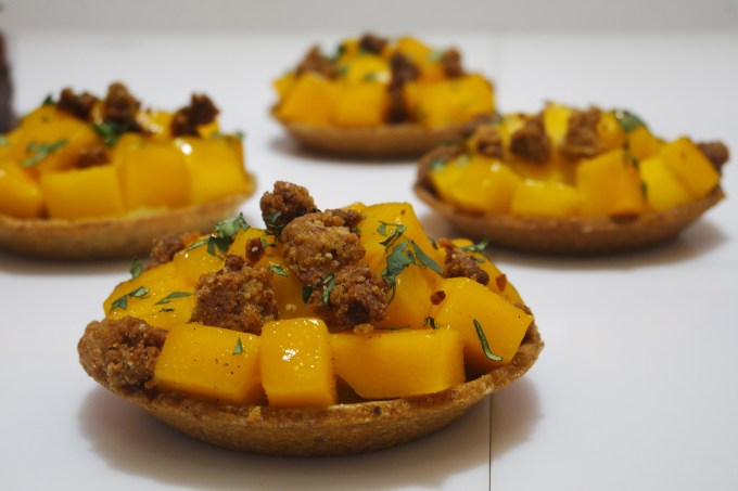 La fruitée : C’est du jamais vu ! On se laisse surprendre par cette création très fraîche, association d’une pâte croquante à l’amande brute, d’une crème pâtissière au riz complet, d’une purée exotique au poivre de kampot, de mangue fraîche, de coriandre et de crumble à l’huile de colza.