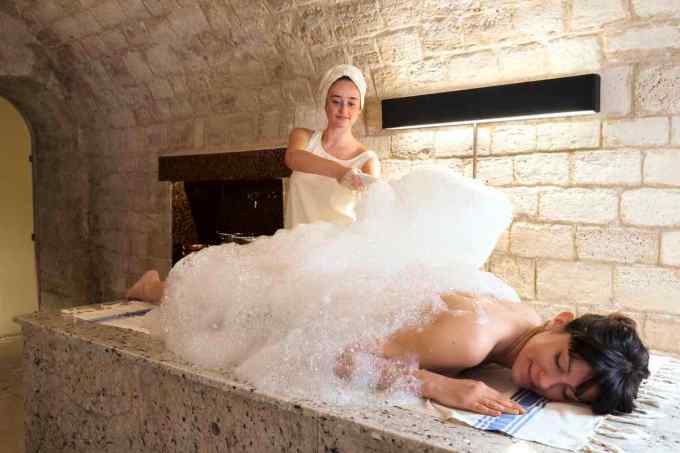 La Cérémonie du Bain Turc très connue dans les sublimes hammams d’Istanbul est différent de celui pratiqué au Maghreb. Tout commence par une douche exfoliante afin d’éliminer tout résidu cosmétique et de préparer la peau à l’application de savon noir. Ce produit est celui de Charme d’Orient, parfumé d’eucalyptus dont l’action est de faire remonter à la surface les toxines. Tout le corps est enduit, frotté puis rincé. Ensuite : étape hammam. Pendant au moins 30 minutes vous alanguissez votre corps et apaisez votre esprit. S’ensuit un gommage très tonique au gant de Kassa, rugueux à souhait. Des lambeaux de cellules mortes s’en vont comme des pluches pas très jolies sur la peau, mais avec la sensation d’être dans un état de grande pureté. Après un rinçage, l’étape mousse de lait vient parfaire l’enchantement purifiant. La praticienne prépare une