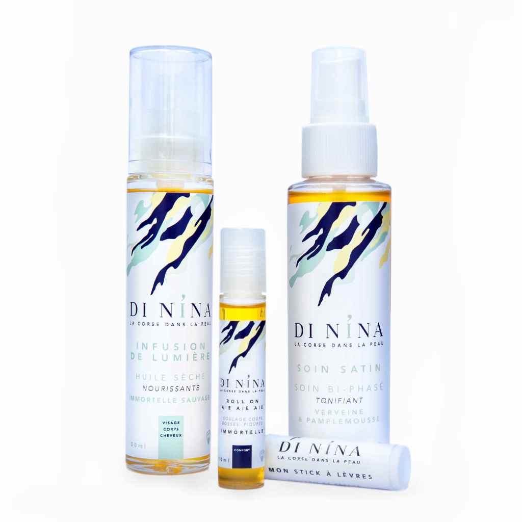La Corse c’est avant tout l’Ile de Beauté, la bien nommé avec une nature particulièrement sauvage. Les plantes poussent la plupart du temps selon les caprices de la nature avec une force et une énergie qu’elle transmettent ensuite aux produits qui les intègrent. La star des plantes corses est l’Immortelle, l’hélichryse dont on tire une huile essentielle d’exception et des actifs cosmétiques régénérants et anti-âge très recherchés. Sa couleur jaune d’or et son parfum suave font des champs où elle pousse des « antichambres » du paradis. Il est évident que les produits di Nina sont gorgés d’Immortelle. Mais d’autres plantes du maquis sont à l’honneur : le romarin, la verveine citronnée, la myrte, l’abricot… Toutes aussi sauvages et débordantes de cette énergie rustique et puissante.