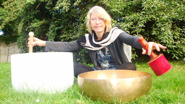« Je suis musicienne, pianiste à la base, j’ai toujours été passionnée par la musique, les sons de la nature et les animaux. J’ai commencé à jouer du piano à l’âge de 3 ans. Je suis allée au conservatoire à Paris, puis j’ai pris des cours particuliers avec une prof atypique anglaise qui m’a ouverte à d’autres horizons, puis, je me suis mise à jouer des musiques que je n’avais jamais apprises, j’ai compris par la suite que je « canalisais » des sons et des musiques et que je communiquais avec des êtres de la nature, entre autre les oiseaux et les dauphins. Cela me permettait de surmonter pas mal de « bémols » de ma vie. Cela m’a amené à travailler sur moi vers l’âge de 17 ans. Je me suis intéressée à la psycho-généalogie et aux constellations familiales avec Alejandro Jodorowsky entre autre. J’ai fait un parcours dans le « Nursing. touch » (toucher dans le nursing) avec un médecin formé à la psycho-somato-thérapie. Et chemin faisant, j’ai rencontré les bols tibétains et les percussions avec un musicien-thérapeute avec lequel j’ai fait tout un parcours. Puis, j’ai intégré les bols tibétains avec mon piano. J’ai suivi la formation « Tomatis » (« Ecoute et Langage », la Voix ne contient que ce que l’Oreille entend, méthode du Dr Alfred Tomatis). Je me suis installée comme thérapeute en enseignant des cours de piano thérapeutique et j’ai rajouté ensuite une formation en sonothérapie avec bols tibétains, bols de cristal et diapasons, qui vient du Québec. Je me suis formée au chant harmonique avec David Hykes, entre autre. Puis j’ai voulu comprendre comment cela fonctionnait au niveau du cerveau. J’ai alors suivi une formation sur les mémoires (court, moyen et long terme) où j’ai appris que les malades d’Alzheimer pouvaient récupérer une partie de leur mémoire en travaillant l’audition sans le visuel. Juste au travers de l’écoute. Je me suis aussi occupée d’enfants à caractère autistique et handicapés. J’ai eu de nombreuses consultations. Avec le temps, j’ai créé ma propre méthode. J’avais une recherche très personnelle. Je voulais savoir qui je suis, quelle est ma place, avec un besoin de verticalité, d’ancrage et comprendre le pourquoi de la présence si importante des sons dans ma vie.