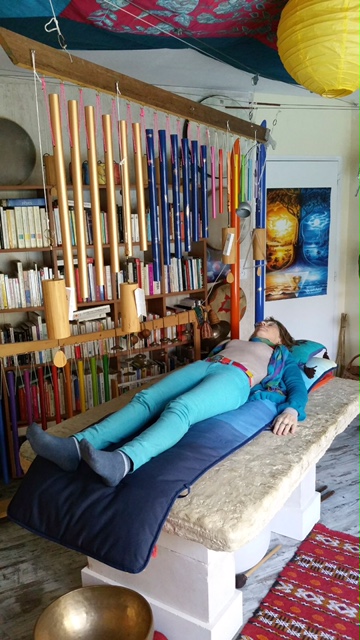 Globalement la séance dure une heure. Tout commence par un entretien de trente minutes. Je précise mes attentes personnelles par rapport à la séance et j’aborde les moments clés de ma vie. Etant familière des accompagnements psychologiques je sais que le travail a déjà débuté, les liens se font, elle réagit subtilement m’invitant à connecter certains éléments entre eux. Lorsque je quitte mon siège pour m’allonger sur la table de pierre mon état est déjà en pleine mutation. Le bain de sons commence et c’est difficilement descriptible car d’une part j’avais les yeux fermés et je n’étais pas dans une intellectualisation de l’expérience.