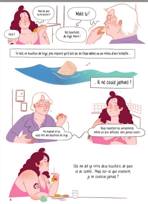 Marie de Brauer s’appuie sur une réflexion que lui faisait sa mère : être un bouchon de liège, flotter, ne jamais se laisser couler ! entre nous, nous pourrions tous adopter ce conseil, même si nous n’avons aucun souci de surpoids. Quel beau commentaire sur lequel s’appuyer, quel que soit le contexte. Ne jamais couler ! quels que soient les souffrances. Se laisser flotter comme le bouchon de liège ! Au fil des pages et des dessins, Marie de Brauer, nous raconte son enfance de bébé bonheur, dodu et heureux, ses sourires de jeune femme, ses envies d’être belle, ses gourmandises. Et un jour, les injonctions à maigrir, à faire des régimes, la course aux médecins, les menaces, les craqueries, la culpabilité, jusqu’à la rencontre avec elle-même, avec son talent : son humour. Mais la route est longue et pleine d’embûches pour notre Marie. L’amour, la sexualité, les prises de consciences, les moments de désespoir, la thérapie et son investissement dans le féminisme, son amour pour autrui. Elle avance, se blinde mais se perçoit comme un bouchon de liège qui flotte quelles que soient les tempêtes. C’est sa vie et jusqu’au bout elle sera empreinte de ce corps qui est son vrai levier d’évolution et de maîtrise. Marie de Brauer, généreuse. Merci pour cet ouvrage de qualité.