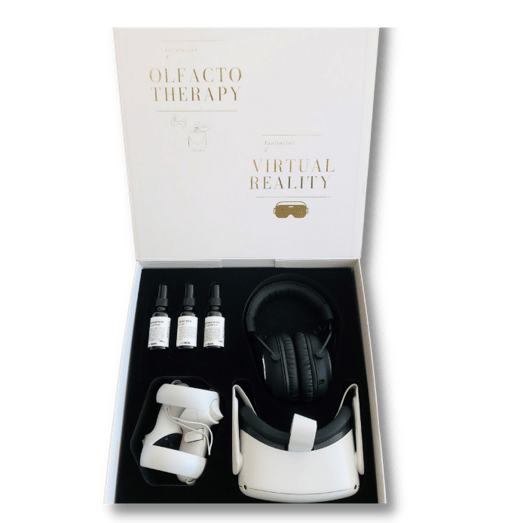 Je lui ai demandé comment elle avait créé ce concept et ce coffret. Elle m’a répondu « avant même que tout commence, une personne de ma famille est tombée gravement malade. J’ai souhaité l’accompagner et lui faire du bien. Je connaissais toutes les méthodes. Je voulais trouver une manière de mettre ensemble tout ce que je connaissais dont je savais que cela lui ferait grand bien. J’avais besoin, pour moi-même, de me ressourcer car j’étais submergée et je voulais l’aider, elle. La réflexion est partie de là. J’avais beaucoup d’outils ; J’ai cherché à créer une synergie de toutes ces méthodes que je connaissais et que j’avais déjà expérimenté. Cela s’est concrétisé lorsque j’ai eu à créer un rituel d’olfactothérapie pour un laboratoire et que j’en ai compris la puissance. J’ai aussi au même moment découvert le casque de réalité virtuelle avec une immersion complète. J’ai eu alors un déclic. J’ai concrétisé ce lien entre la réalité virtuelle, l’olfactothérapie et j’ai vu que nous avions une action immédiate. Donc l’idée de mettre au point cet outil est venu très rapidement, suite il faut toujours du temps pour ajuster les Details. »