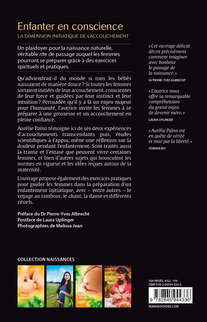 Aurélie Païno, s’appuie sur sa propre expérience de naissances naturelles avec une ouverture de conscience qui la fit accéder à la dimension initiatique. Elle livre avec des mots forts, puissants mais simples ses interrogations sur la sexualité, l’enfantement et le chemin de l’âme dans l’incarnation. La transcendance peut être compatible avec une vie faite d’instinct, de vérifications scientifiques, d’intuition et de volonté de partager avec les femmes. Elle croit à cette force naturelle des femmes et à leur capacité à gérer non seulement leur accouchement, mais la dimension spirituelle, énergétique et initiatique. Dans ce livre Aurélie Païno invite les femmes à se préparer à une grossesse et un accouchement en toute confiance. Qu’en est-il de la douleur ? est-ce à ce point obligatoire ? serait-ce un conditionnement qui vient du fond des âges. Quelle est la place de la conscience dans tout ce processus