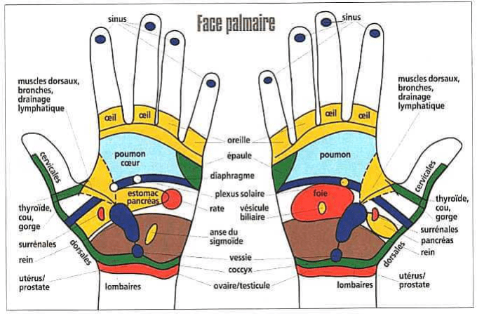 Les mains : les zones sont précises et répertoriées exactement comme pour les pieds. Les mains comportent plus de 3000 terminaisons nerveuses en relation avec tout l’organisme ! Les études démontrent que les zones des pieds ont une action directe sur le système neuro-végétatif, c’est-à-dire l’inconscient alors que celles des mains ont un accès au cortex et au conscient. Les bienfaits sont nombreux aussi bien pour la relaxation que pour évacuer contractions, désordres physiologiques ou énergétiques. Lors de la pratique, il est surprenant de constater à quel point les mains condensent de blocages et tensions. Masser les mains en profondeur donne d’excellents résultats. Il est à noter que la réflexologie des mains est très propice à l’automassage. On peut aisément passer d’une main à l’autre et travailler sur toutes les faces. Les zones réflexes sont moins nombreuses que sur les pieds mais aussi efficaces. Un petit avantage de la comparaison des massages des mains ou pieds est que beaucoup de personnes sont très chatouilleuses sur les pieds.