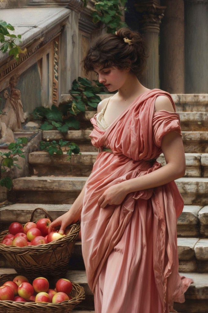 Elle goûte à la grenade — fruit rouge, pulpeux, symbole ancien de fécondité et de sexualité.